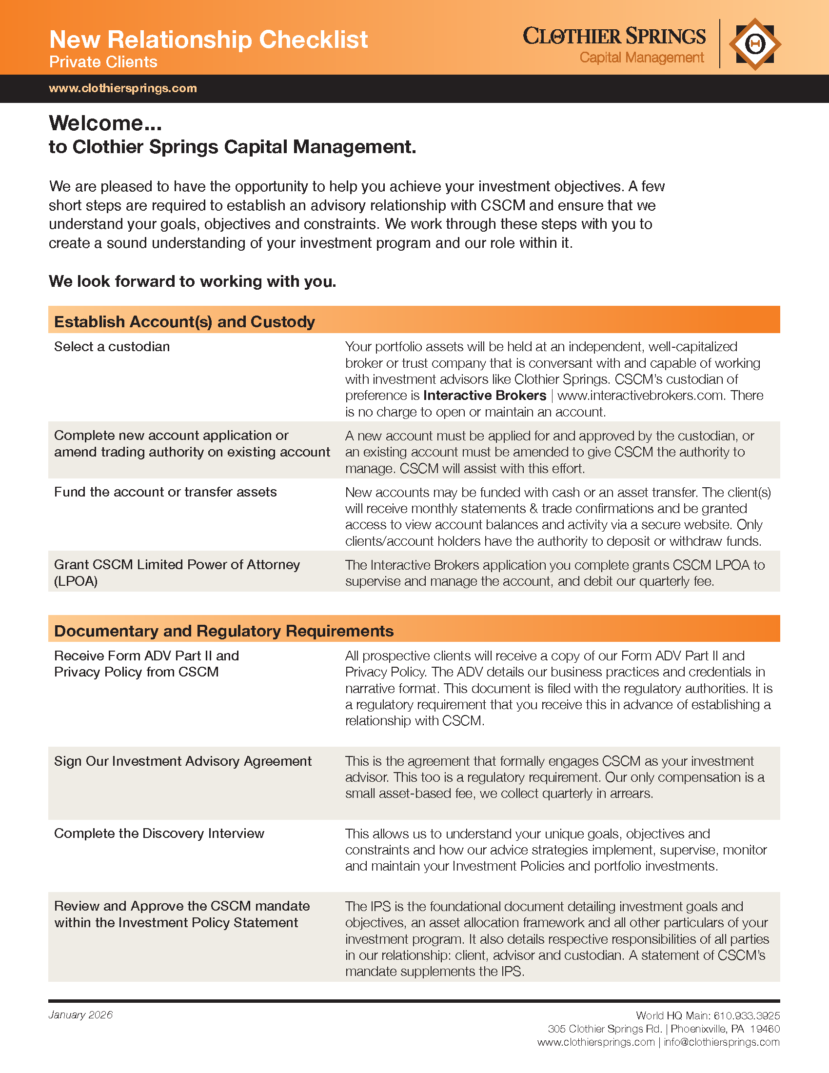 Download our NEW RELATIONSHIP CHECKLIST to see the steps we take together to establish a sound and compliant investment advisory relationship.